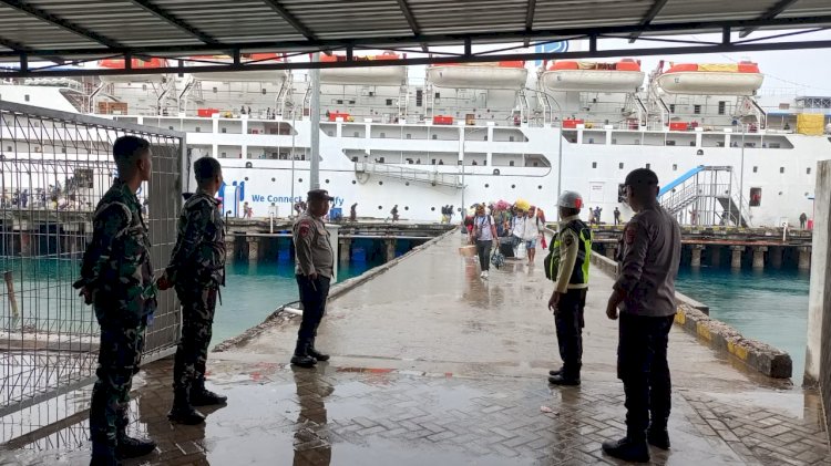 Tribratanewskupangkota.com — Personel Polsubsektor Pelabuhan Tenau, Polresta Kupang Kota yang dipimpin langsung oleh Kapolsubsektor Pelabuhan Tenau, IPTU Teguh Imam Santoso, melaksanakan pengamanan kegiatan debarkasi penumpang Kapal KM Sirimau dan KM Lambelu yang sandar di Dermaga Lokal Pelabuhan Tenau, Kota Kupang, sebagai upaya menjamin keamanan, ketertiban, dan kelancaran arus penumpang menjelang perayaan Hari Raya Natal 2025 dan Tahun Baru 2026.