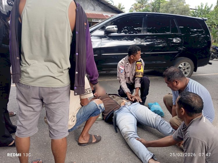 Tribratanewskupangkota.com — Bhabinkamtibmas Polsek Alak, Polresta Kupang Kota, yaitu AIPTU Bonevantura T. Luma (Bhabinkamtibmas Kelurahan Manulai Dua) bersama AIPTU Imran Ibrahim, S.Sos (Bhabinkamtibmas Kelurahan Batuplat) melakukan pertolongan dan mengevakuasi korban kecelakaan lalu lintas tunggal di Jalan Jambu, Kelurahan Manulai Dua, Kecamatan Alak, Kota Kupang, (Rabu, 25/2/2026) pagi.