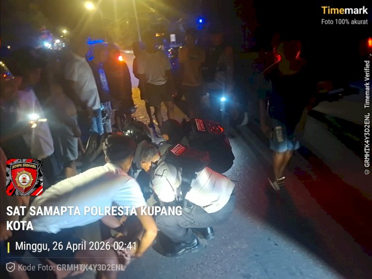 Tribratanewskupangkota.com — Personel Satuan Samapta Polresta Kupang Kota merespons cepat laporan kecelakaan lalu lintas yang terjadi di dekat Taman Tagepe, Kelurahan Kelapa Lima, Kota Kupang, pada (Minggu, 26/4/2026) dini hari.