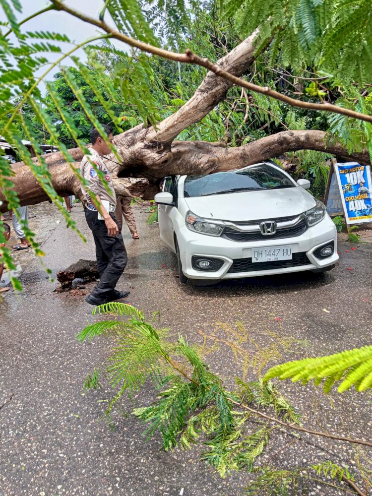 Tribratanewskupangkota.com — Sebuah pohon tumbang menimpa satu unit mobil LCGC (Low Cost Green Car) atau City Car, Honda Brio Satya, serta sebuah tempat usaha cuci motor di Jalan Fetor Feonay, Kelurahan Kolhua, Kecamatan Maulafa, Kota Kupang, (Kamis, 12/02/2026) pukul 11.35 Wita.