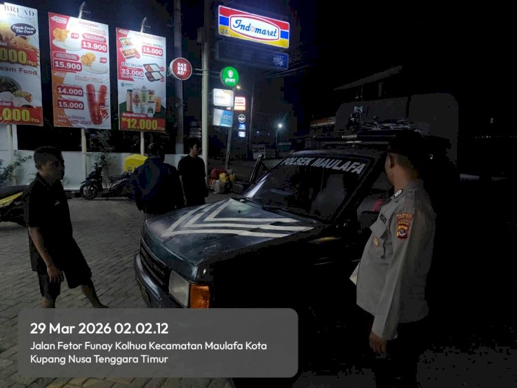 Tribratanewskupangkota.com — Personel Polsek Maulafa, Polresta Kupang Kota kembali melaksanakan kegiatan patroli dini hari, dalam rangka menjaga situasi Keamanan dan Ketertiban Masyarakat (Kamtibmas) di wilayah hukumnya. Kegiatan yang dilaksanakan pada Minggu (29/3/2026) dini hari ini, dipimpin oleh KSPKT II Polsek Maulafa, AIPDA Jhoni Tallo.